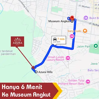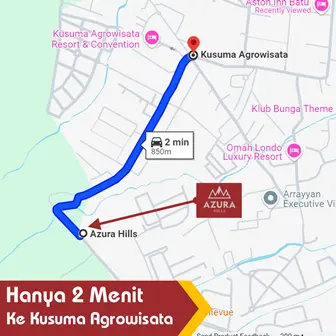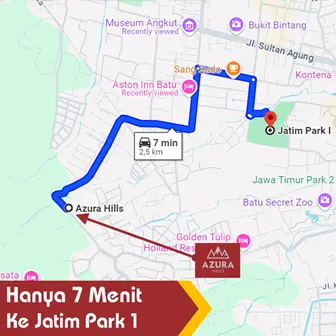 Dengan lokasi strategis Azura Hills yang dekat dengan berbagai destinasi wisata populer di Kota Batu, seperti Kusuma Agro Wisata, Museum Angkut, Jatim Park 1, Jatim Park 2, Eco Green Park, Batu Night Spectacular, alun-alun Kota Batu dll.